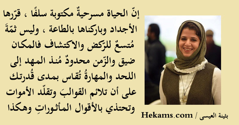 نعرف بأننا نحتاج أسبابا أقسى من العقل والمنطق لكى نبرر الهجرة.أسباب أكثر أنفعالا.أكثر سطوة وحضورا. بثينة العيسى كاتبة كويتية حاصلة على شهادة الماجستير في إدارة الأعمال، وصدر لها روايات منها: The latest tweets from @bothayna_alessa 'نحن ضحايا أنفسنا، الآخرون مجرد حجة', 'الجدران أفضل من يتعاطف. بثينة وائل العيسى هي كاتبة ومؤلفة و روائية كويتية جاء ميلادها بتاريخ 3 سبتمبر عام 1982ميلاديا ، قامت بتقديم عدد كبير من المؤلفات والروايات كان ابرزها رواية سعار و رواية ارتطامٌ.